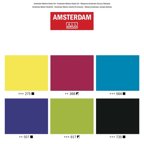 Deze startersset is een geweldige manier om te beginnen met Amsterdam acrylmarkers. De set bevat 6 markers met een middelgrote, ronde penpunt (4 mm) in een basis kleurenpalet. Inhoud: 6 markers (275 Primairgeel - 366 Quinacridoneroze - 564 Briljantblauw - 504 Ultramarijn - 617 Geelgroen - 735 Oxydzwart).