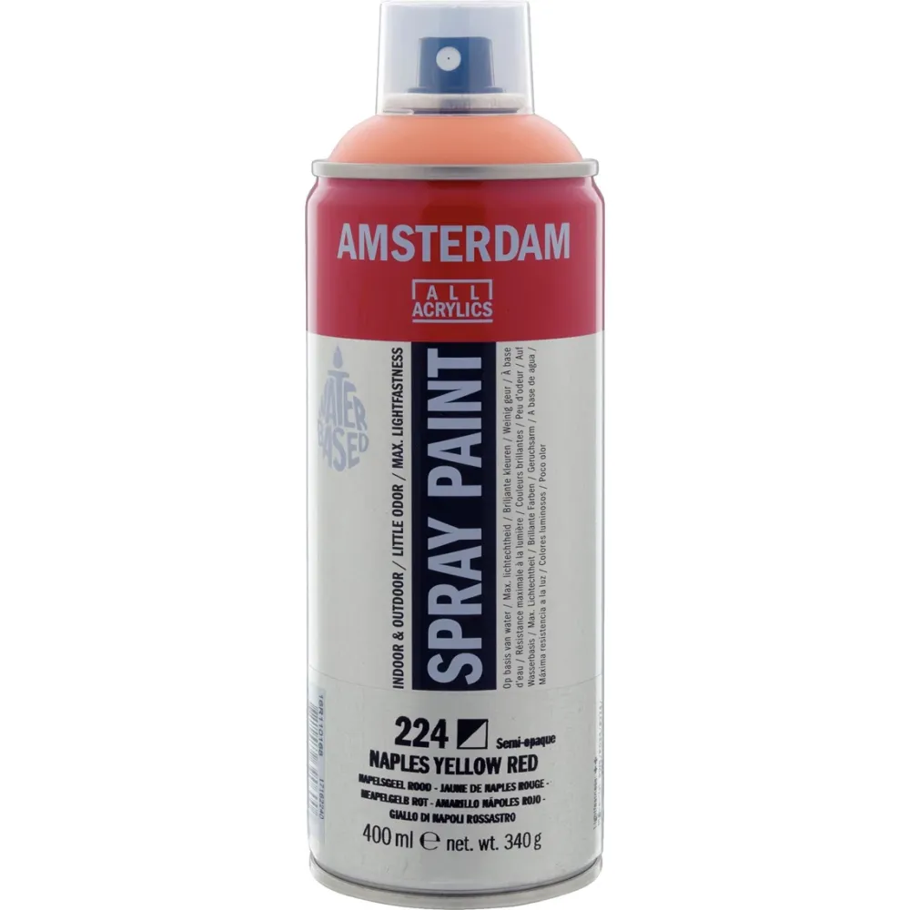 Amsterdam spray paint in Napelsgeel Rood (224) is een semi-dekkende verf met zeer goede lichtechtheid (++).