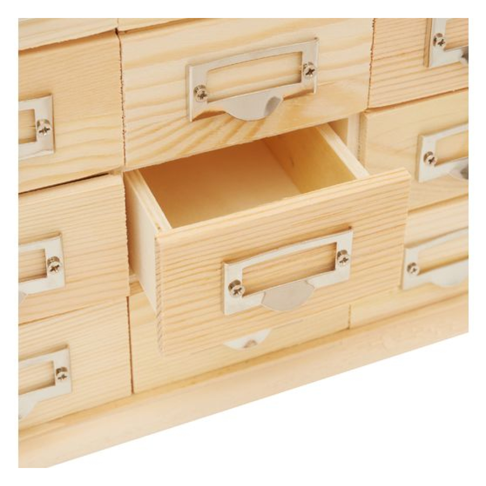 Praktische apothekerskast met 12 kleine lades - ideaal voor het opbergen van kleine artikelen zoals sieraden, cosmetica, kantoorbenodigdheden en nog veel meer. Etiketteervelden met kleine verzonken metalen handgrepen geven een duidelijk overzicht. De perfecte woonaccessoire voor de landhuisstijl. De metalen labels kunnen worden losgeschroefd om het ontwerpen en etiketteren te vergemakkelijken.