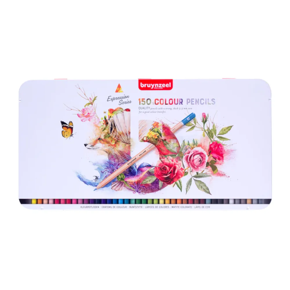 Bruynzeel 150 hoogwaardige kleurpotloden met een sterke, dikke 3.3 mm kern, gemaakt met kwaliteitsvolle pigmenten voor uitstekende kleurafgifte.
