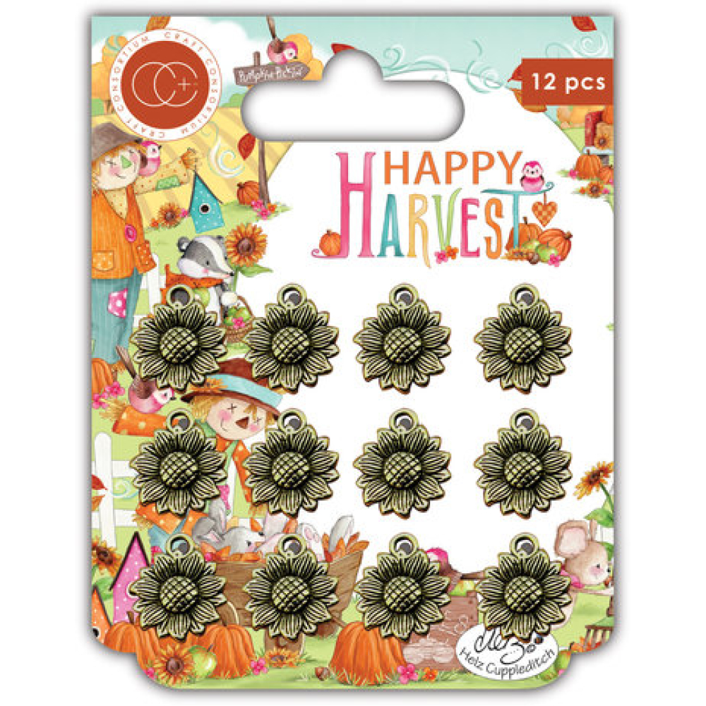 Craft Consortium are delighted to announce the exclusive launch, of our brand-new premium collection, designed in partnership with Helz Cuppleditch, Introducing; 'Happy Harvest'. 'Happy Harvest' is the eleventh instalment in our exclusive partnership, covering the most adorable, hand illustrated whimsical characters, and elements, bold iconic colours which Helz Cuppleditch is renowned for. This collection is perfect for all your Autumnal / Fall / Harvest and Thanks Giving makes right through to Spring, filled with the most adorable scenes and characters. Supported by a series of coordinating embellishments and stamps, this collection is truly one to cherish. A set of 12 Brass, metal, sunflower Charms.