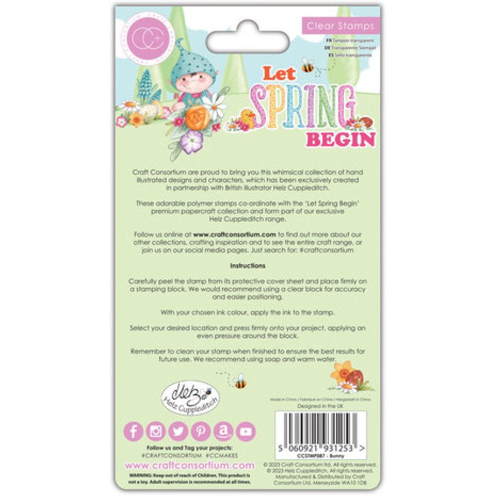 Craft Consortium is verheugd de exclusieve lancering aan te kondigen van onze gloednieuwe premium collectie, ontworpen in samenwerking met Helz Cuppleditch, Introductie; 'Let Spring Begin' 'Let Spring Begin' is de twaalfde aflevering in onze exclusieve samenwerking, waarin de meest schattige, met de hand geïllustreerde grillige personages en elementen, gedurfde iconische kleuren waar Helz Cuppleditch bekend om staat, worden behandeld. Deze collectie is perfect voor al je lente- en zomerpret en paaspret, gevuld met de meest schattige scènes en personages waar je verliefd op zult worden. Ondersteund door een reeks bijpassende versieringen en stempels, een embossingfolder, 3D-decoupage en nog veel meer, is deze collectie er echt een om te koesteren. Een set van 7 hoogwaardige transparante polymeerstempels in bijpassende ontwerpen. Met beschermende acetaatfilm bedrukt met kleurreferenties.