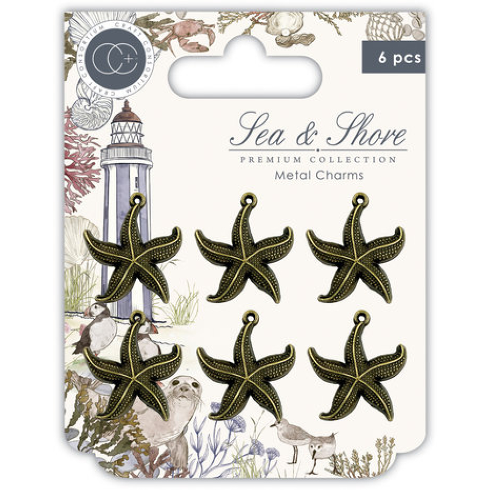 Introductie; 'Zee & Kust'. Zee & Kust; Het negende deel van onze exclusieve samenwerking met het ongelooflijke Hackney & Co. Deze verbluffende collectie met iconische Britse kustelementen, flora, dieren en zeeleven, tilt de Hackney & Co-serie naar een geheel nieuw niveau van prachtige patronen, scènes en wilde dieren om te vallen verliefd op. Het vieren van de echte Britse natuur op zijn best. Ondersteund door een reeks op elkaar afgestemde versieringen en stempels, is deze collectie er een om te koesteren. Een set van 6 zware metalen bedels met stervissen in antiek messing afwerking.
