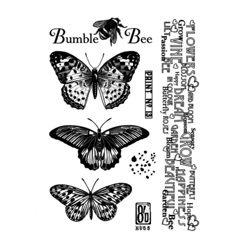These are top quality, finely detailed, unmounted red rubber art stamps ready for you to cut out. Designed and manufactured in England by Crafty Individuals in a nature theme and featuring '3 butterlies, a bee and wording'. With a nature theme, they are perfect for your cardmaking, altered art, journaling and scrapbooking projects. This 'Butterflies and Bees' art rubber stamp A6 Elements plate measures 96mm x 137mm overall.