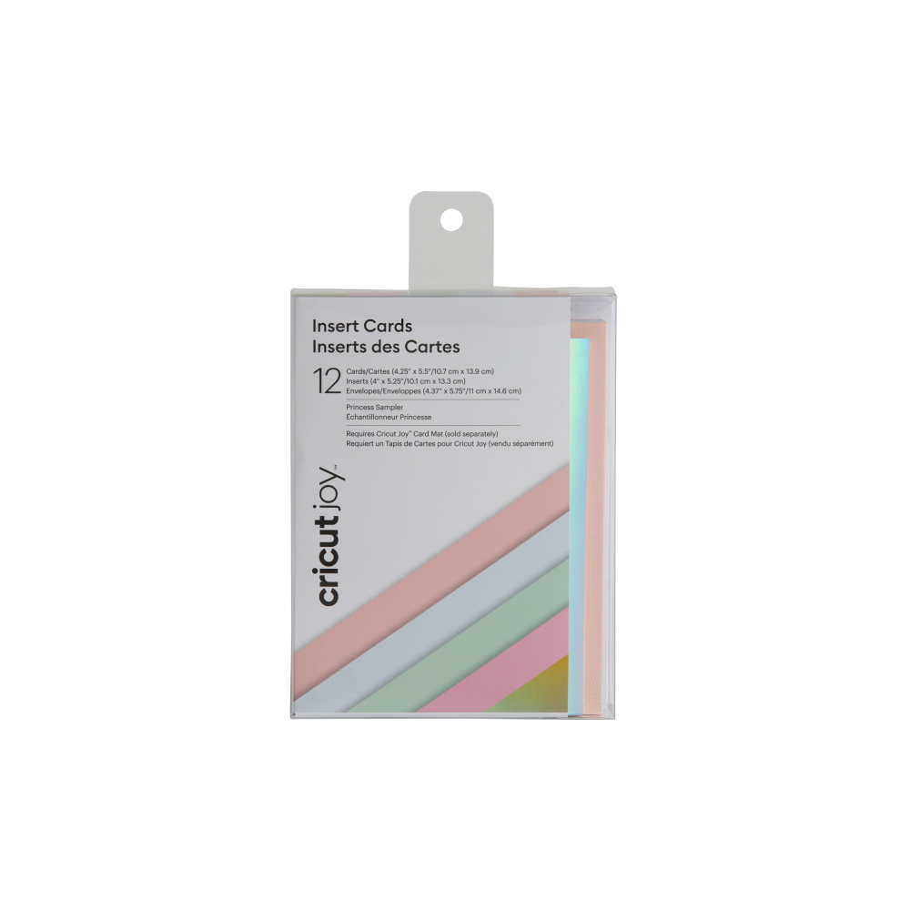 Snelle, gepersonaliseerde wenskaarten met grote impact binnen handbereik met invoegkaarten voor uw Cricut Joy-snijmachine. Het ingenieuze lijmvrije ontwerp zorgt voor tweekleurige, met diepte gevulde kaarten zonder geknoei of gedoe. Knip ingewikkelde en betekenisvolle woorden en afbeeldingen in de voorkant van de kaart om de prachtige invoegkleur zichtbaar te maken. Deze kaarten van A2-formaat bevatten witte enveloppen en zijn verkrijgbaar in talloze kleuren om elke kaartontvanger op uw lijst te plezieren! Voor gebruik met Cricut Joy. Vereist Cricut Joy Card Mat (apart verkrijgbaar). 12 A2-kaarten (3 van elke kleur) in Tulip, Powder Blue, Whispering Blue, Lavender; 12 zilveren holografische inzetstukken; 12 Witte enveloppen