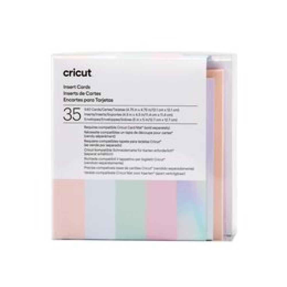 Snelle, gepersonaliseerde wenskaarten met een grote impact zijn binnen handbereik met Cricut®-insteekkaarten. Snijd ingewikkelde en betekenisvolle woorden en afbeeldingen in de voorkant van de kaart om de prachtige kleur van het inzetstuk te laten zien. Het ingenieuze, lijmvrije ontwerp zorgt voor tweekleurige, met diepte gevulde kaarten zonder rommel of gedoe. Deze sampler bevat kaarten in een drietal kleuren, gratis inzetstukken en witte enveloppen - een opwindend assortiment om elke kaartontvanger op je lijst te plezieren! Vereist een compatibele Cricut Card Mat (apart verkrijgbaar). Verkrijgbaar in verschillende maten en kleurstellingen. 35 kaarten in tulp (9), poederblauw (9), fluisterblauw (9), lavendel (8); 35 inzetstukken in zilver holografisch; 35 witte enveloppen. Afmetingen: S40-kaarten 4,75 inch x 4,75 inch (12,1 cm x 12,1 cm), insteekkaarten 4,5 inch x 4,5 inch (11,4 cm x 11,4 cm), enveloppen 5 inch x 5 inch (12,7 cm x 12,7 cm). Maak levendige tweekleurige wenskaarten zonder de rommel of het gedoe van lijm. Gemakkelijk te snijden met de speciale Cricut Card Mat (apart verkrijgbaar). Voor Cricut Explore®- en Cricut Maker®-machines.