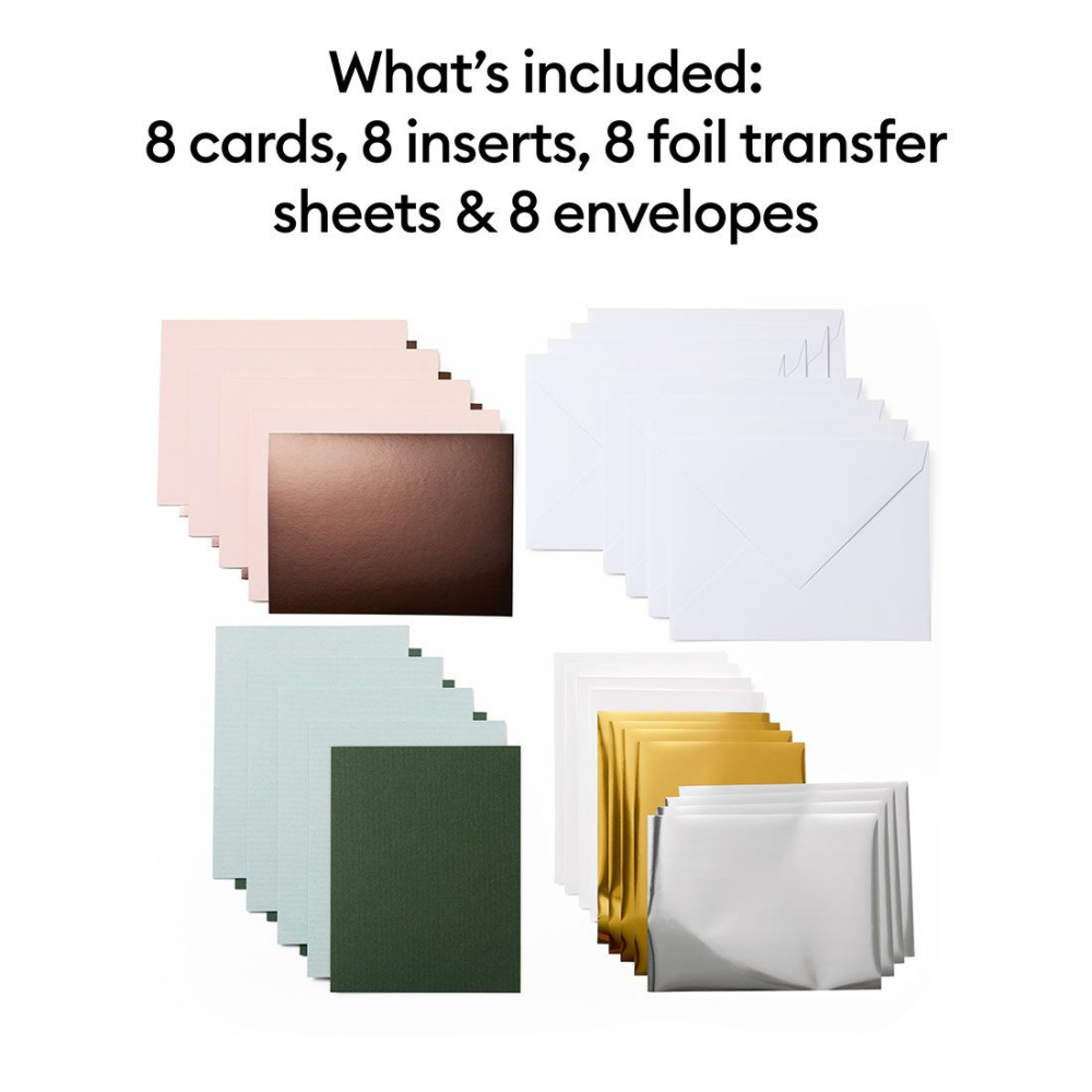 Deze set van kaarten, foil transfer, inserts en enveloppen gebruikt u i.c.m. de Cricut Joy Insert Card Mat.