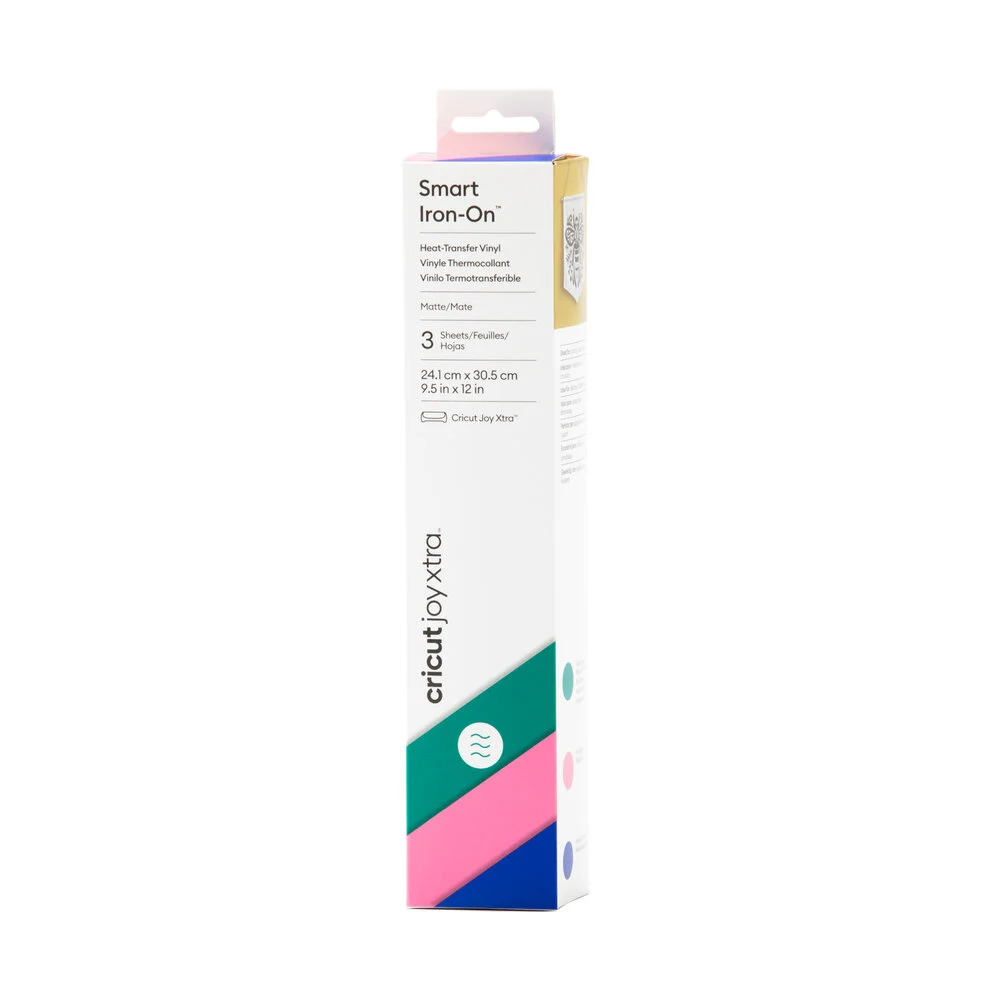 Wear your creativity on your sleeve, your pocket, or your pant leg with Smart Iron-On. This clever crafting material works without a cutting mat, so you can just load and go. So adding a little personality to a T-shirt, jean jacket, or a backpack is no sweat. Smart Iron-On works fabulously on a wide variety of materials and outlasts 50+ washes! For use with Cricut Joy Xtra. For effortless application, use Cricut EasyPress. Care Instructions: Allow 24 hours after application before washing. Wash and tumble dry inside out. Do not bleach. If you need to iron, only iron on the backside of the garment. Features: 3 sheets 9.5 in x 12 in (24.1 cm x 30.5 cm) in Bright Teal, Pink, Royal Blue. Works without a machine mat - just load & go! Outlasts 50+ washes. Layer up to 3 colors for standout patterns & projects. For Cricut Joy Xtra.