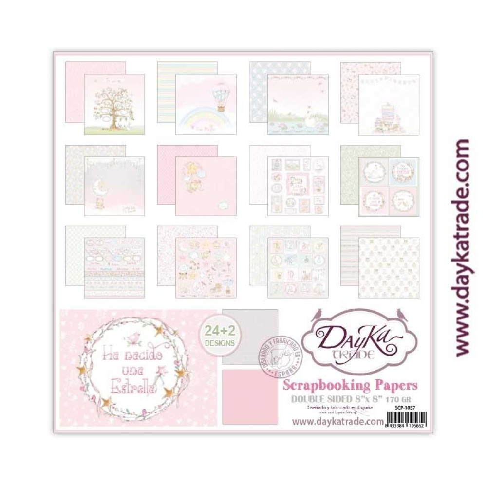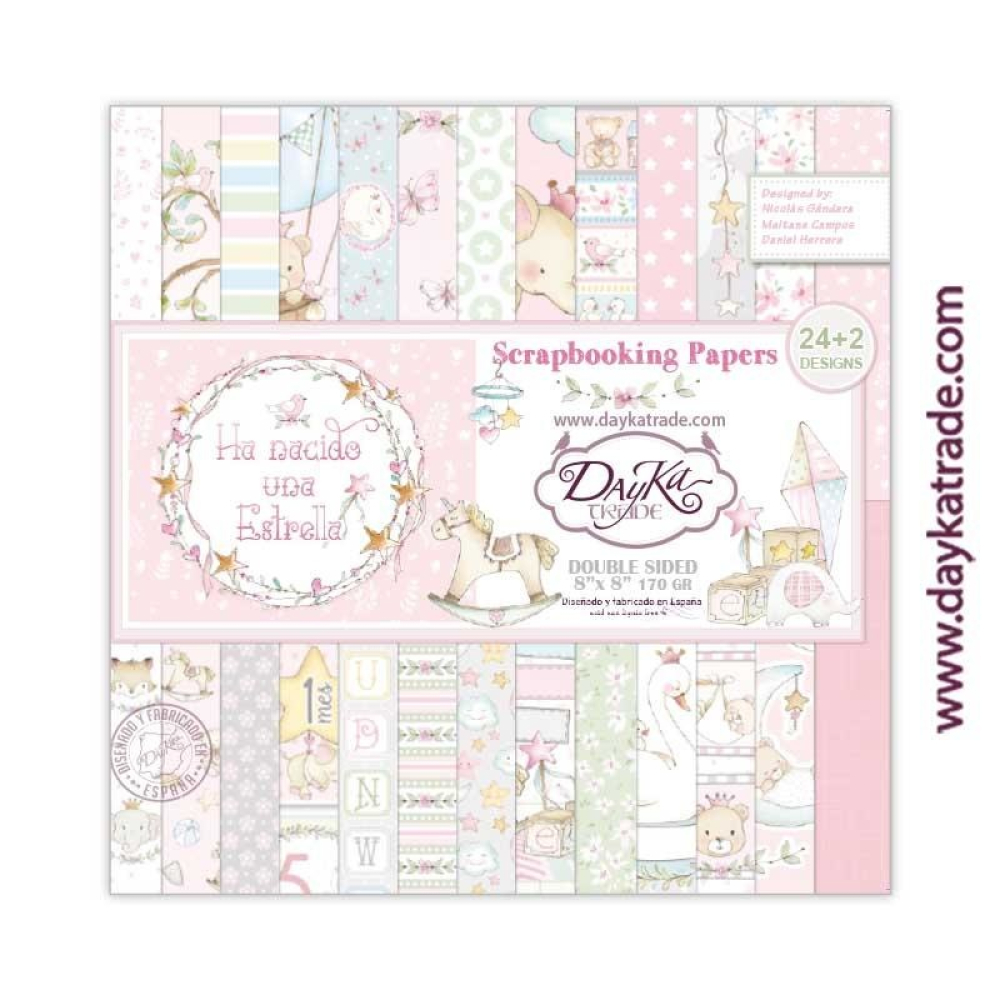 Paper pack for Scrapbooking Dayka. 8x8 inch. Double sided. 170 gr. Designed and produced in Spain. Acid & lignin free. 24+2 designs.