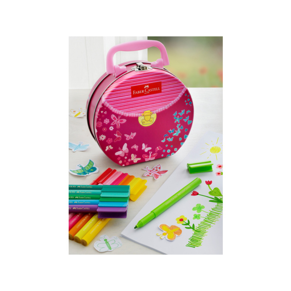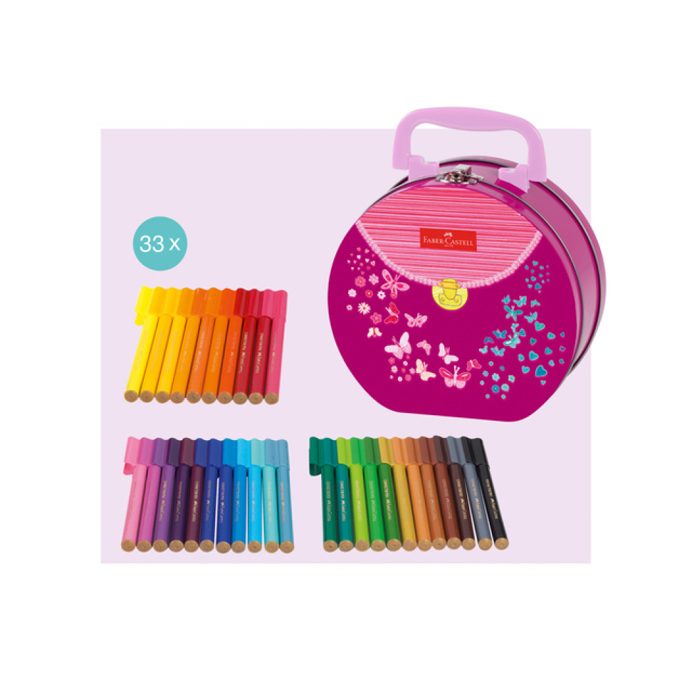 De viltstift met de speciale clip, de connector viltstift. Door speciale clip op de doppen kunnen de viltstiften eenvoudig in elkaar worden geklikt. De set heeft schitterende kleuren, wast uit de meeste textielsoorten. Deze stiften moedigen kinderen aan om geweldige tekentechnieken te ontwikkelen voor onbeperkte creativiteit. Leuk verpakt in hoogwaardig blik in handtas vorm, ideaal voor opslag en voor onderweg. Het perfecte cadeau voor elke gelegenheid. Inhoud: 33 stuks assorti kleuren.