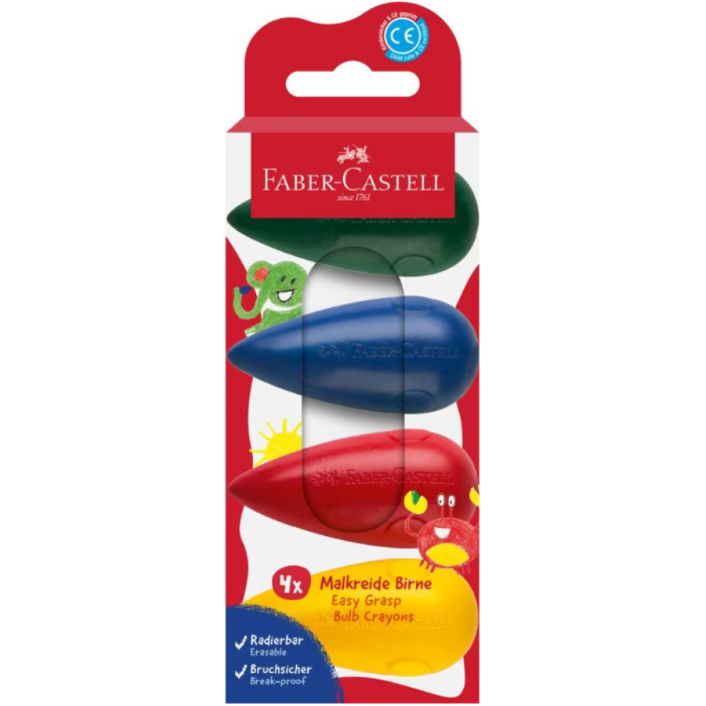 Waskrijt in bolvorm is ideaal voor eerste pogingen tot creatief tekenen met deze vuistgreep. Ideaal voor kinderen vanaf 2 jaar. De uitwisbare krijtjes zijn van goede kwaliteit en geven gemakkelijk heldere kleuren op het papier. De krijtjes geven minimaal af op handen en kleding. Doosje met 4 kleuren groen, blauw, rood, geel.