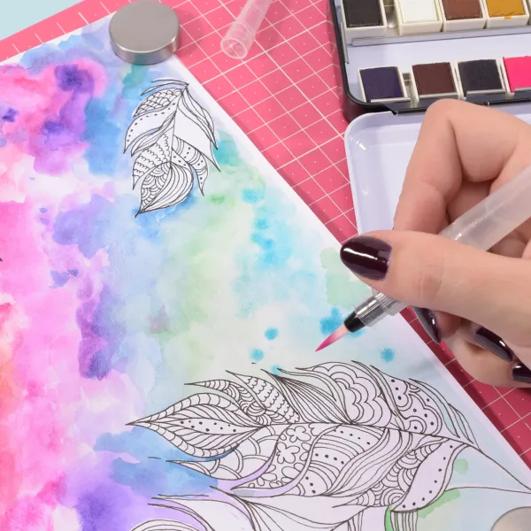 Naast aquarelverf of potloden kun je ook gebruikmaken van aquarelstiften, kleurpotloden, brush pennen, viltstiften, fineliners, waterverf of inkt. Snijd de vellen eenvoudig op maat voor kleinere projecten of kies voor een andere papiersoort als basis. Het Florence aquarelpapier is verkrijgbaar in de volgende formaten: A6, A5, A4, A3 of vierkant (30,5 x 30,5 cm) en is ook beschikbaar in 300 g/m² vellen met een glad of ruw oppervlak. Textuur aquarelpapier is een goede basis voor aquareltechnieken zoals de nat-in-nattechniek of het laveren, omdat dit papier nog beter tegen water kan en niet krom trekt.