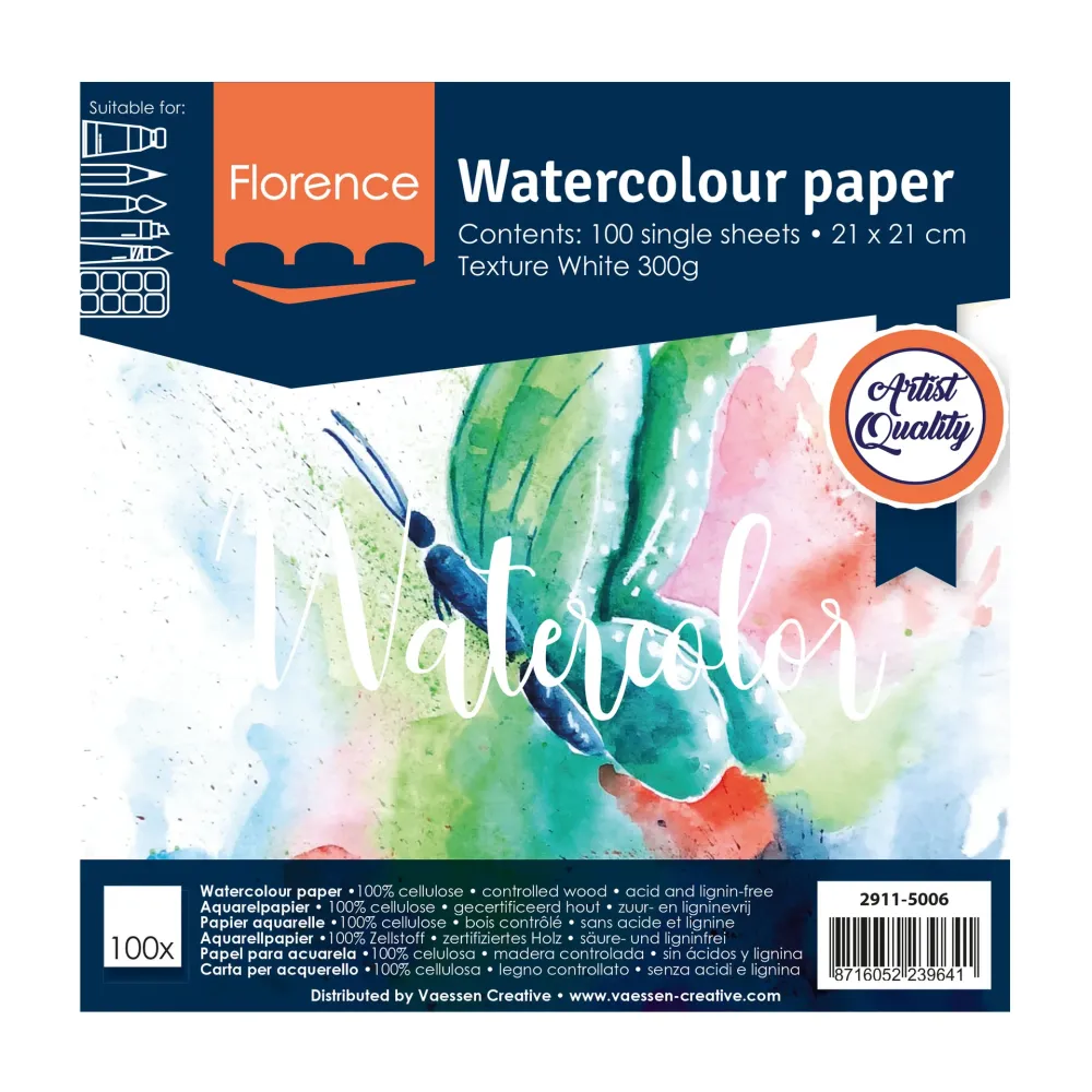 Het Florence aquarelpapier A4 van Vaessen Creative is kwalitatief ruw aquarelpapier voor allerlei toepassingen, waaronder tekenen, schetsen, handlettering, stempelen, aquarel verven en aquarelleren met potloden. Het heet geperste aquarelpapier met een gewicht van 300 g/m² heeft een ruw oppervlak met veel textuur en wordt graag gebruikt door zowel kunstenaars als hobbyisten van alle leeftijden. Het papier bestaat voor 100% uit cellulose en is zuur- en ligninevrij waardoor het bestand is tegen veroudering en levendige kleuren worden behouden.