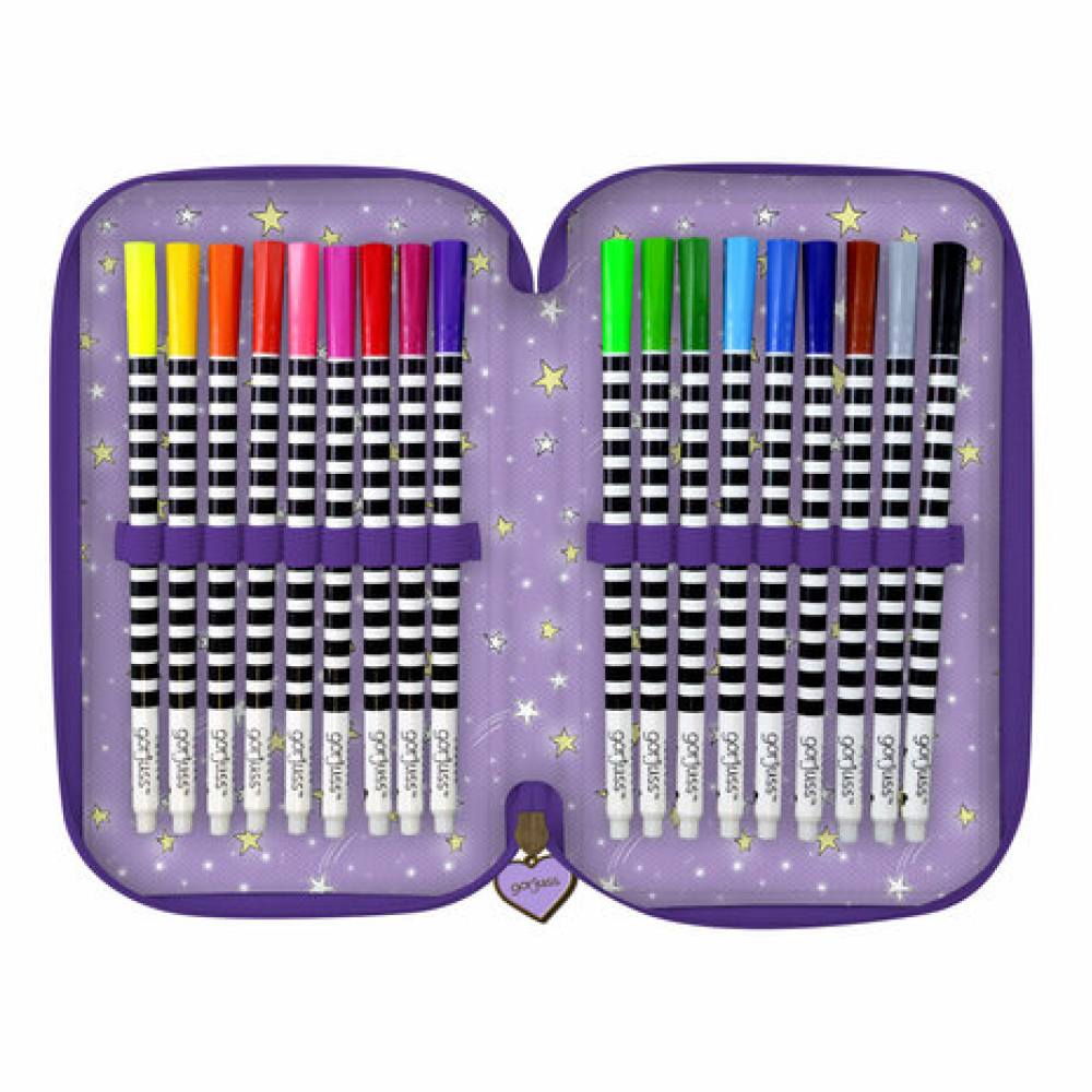 Perfect for school, this filled pencil case contains all the stationery essentials. Pens, pencils, rulers, and so much more leads to a world of creativity. Featuring sparkly Catch A Falling Star artwork. Filled pencil case. 3 compartments. Glittery fabric. Zip closure. Eraser. Pencil sharpener. Ball point pens - red, blue, black. HB pencil. Ruler set. 18 colouring pencils. 18 felt-tip pens. Approx Measurements: 20.5 x 12.5 x 6.5cm.