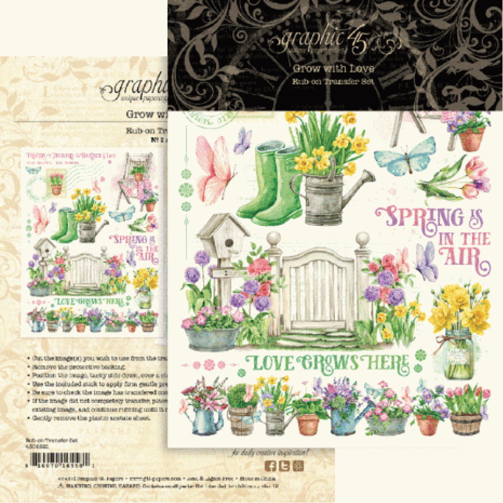 Grow with Love Rub-On Transfers. Two Sheets - 6" x 8 “easy-to-use rub-on set. Seamlessly blends onto any smooth surface. Acid & Lignin Free. Includes popsicle stick. Grow with Love - G45 Paper Collection. Introducing Graphic 45's flourishing new paper collection, Grow with Love, a celebration of the beauty found in spring blossoms, charming garden gates, and delightful birdhouses. Immerse yourself in the soft hues of pink, lilac purple, daffodil yellow, and lush greens, reminiscent of a blooming garden in full splendor. This collection brings nature's elegance to life through meticulously designed decorative cardstock stickers, run-on transfers, ephemera, and chipboard tags & frames. Grow with Love is an invitation to infuse your creative endeavors with the fresh and delightful essence of the season, making every project a testament to the beauty found in nature's embrace. This collection is perfect for scrapbook layouts, mini albums, folios, planners, card making, and off-the-page home decor projects.