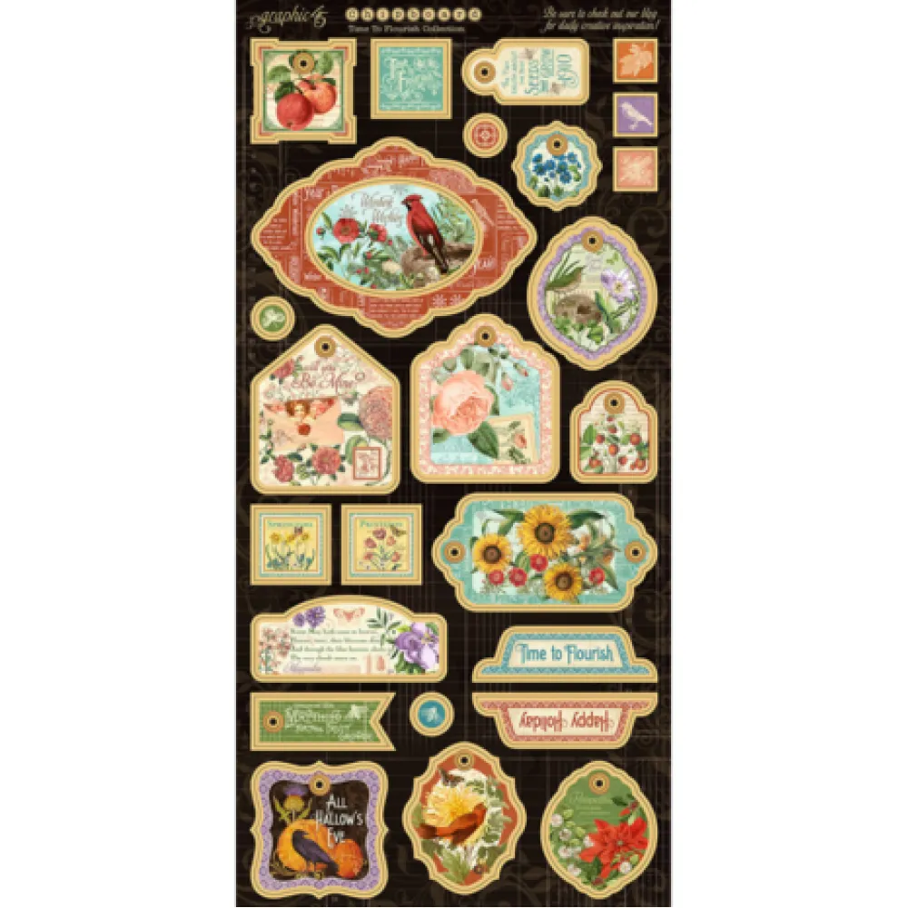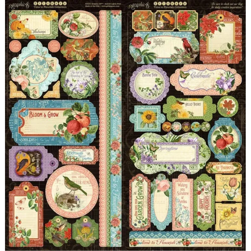Time to Flourish Deluxe Collector’s Edition. Papercrafting Set 12 x 12 inch; 24 double-sided 12×12-inch sheets (1 each of 24 designs); (2) 6x12 inch cover weight stickers sheets; 26 die-cut chipboard embellishments. Features easy to use cut-apart and designer papers. Made in the USA, cover-weight papers are acid and lignin free. Time to Flourish Deluxe Collector’s Edition. Graphic 45 is delighted to announce an alluring new Deluxe Collector’s Edition, Time to Flourish, a calendar collection. Smell the beautiful blossoms yearlong, with the stunning botanical patterns and our ever versatile cut-aparts. The rich color palette reflects the iridescence of the four seasons. This collection is going to dash off your shelves and will be perfect for calendar projects, cards classes, giftware and much more. With this new DCE the creativity will last all year long.