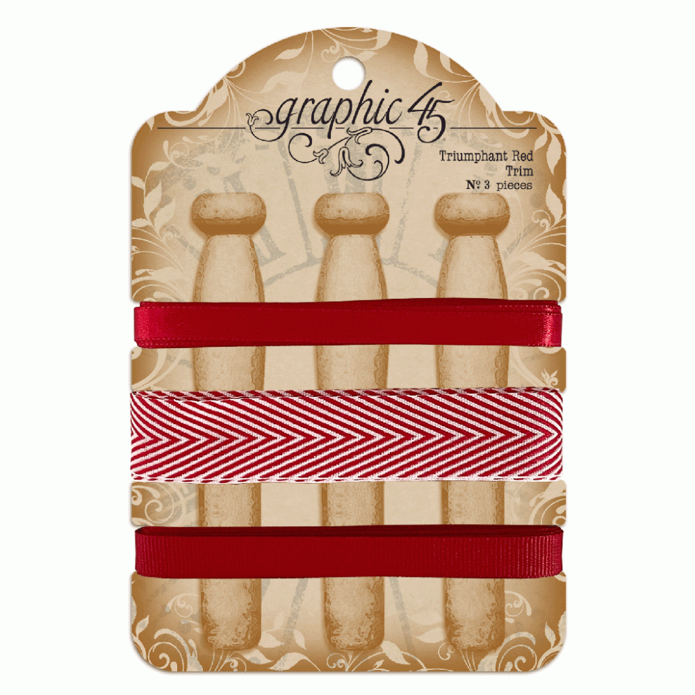 Triumphant Red Trim. May Arts Ribbon. 3 pieces (3 yard lengths, 9 yards total). 3/8 inch Satin Ribbon, 3/4 inch Chevron Ribbon, 3/8 inch Grosgrain Ribbon. Graphic 45 is thrilled to introduce May Arts Trim, a perfect compliment to any G45 collection.