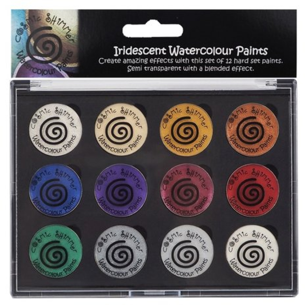 Cosmic Shimmer Iridescent Watercolour Palette Set. Watercolour paints that have an iridescent sheen, that catches the light to give off a sparkling effect. Perfect for use on card, paper, crafts, walls and furniture. Mist with water to achieve the depth of colour you desire.