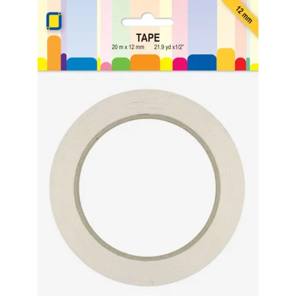 Tape, dubbelzijdig dun papieren tape in 4 maten; 3mm, 6mm, 9mm, 12mm. Dubbelzijdig tape is zeer goed te gebruiken voor alle papier hobbies en kaarten maken. Het tape is gemakkelijk af te scheuren, zonder dat hierbij een schaar nodig is. 20 meter x 12 mm.