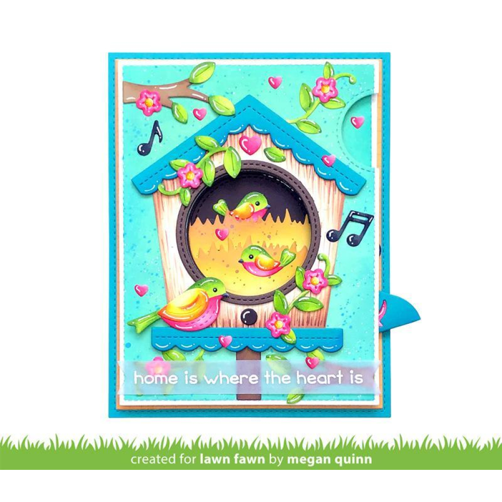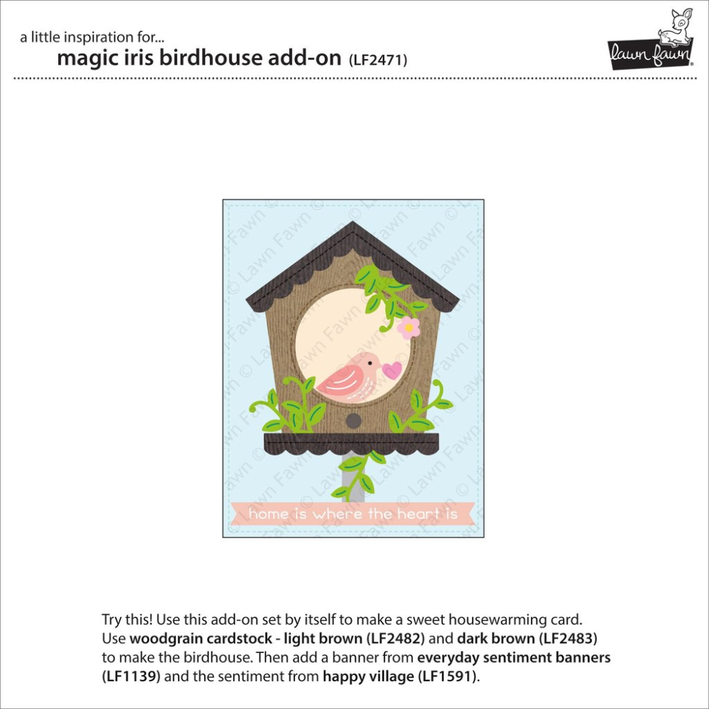 Combineer deze uitbreidingsset met Magic Iris om een leuk, interactief vogelhuisje te maken dat opengaat om een verrassing te onthullen! Gebruik woodgrain cardstock om het vogelhuisje een houtachtige textuur te geven. Deze Lawn Cuts-set kan ook op zichzelf worden gebruikt om een schattige vogelhuiskaart te maken.