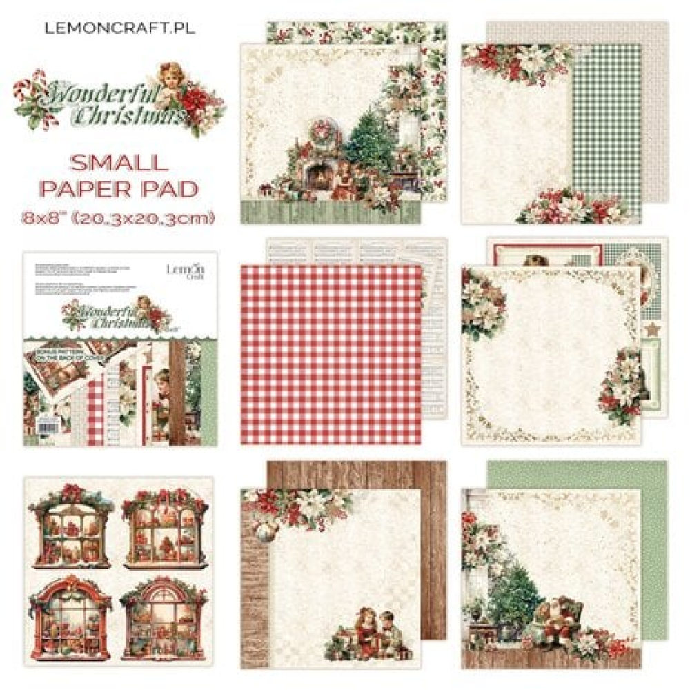 Small pad of scrapbooking papers 20,32x20,32cm - Lemoncraft - Wonderful Christmas collection. Pad containst 18 double-sided papers, 12 designs - 3 pieces per design, 250gsm. Bonus pattern at the back of the cover.