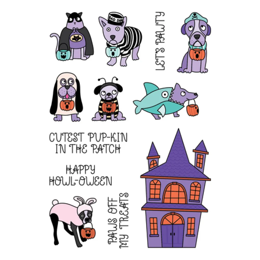 Knock knock! Who's there? Only the most darlingest trick or treaters ever! Ruff! Ruff! Give us candy and stuff! Coordinates pawfectly with Trick or Treat Coordinating Die Set. 12 Stamps. 4x6 Stamp Set. Clear Photopolymer.