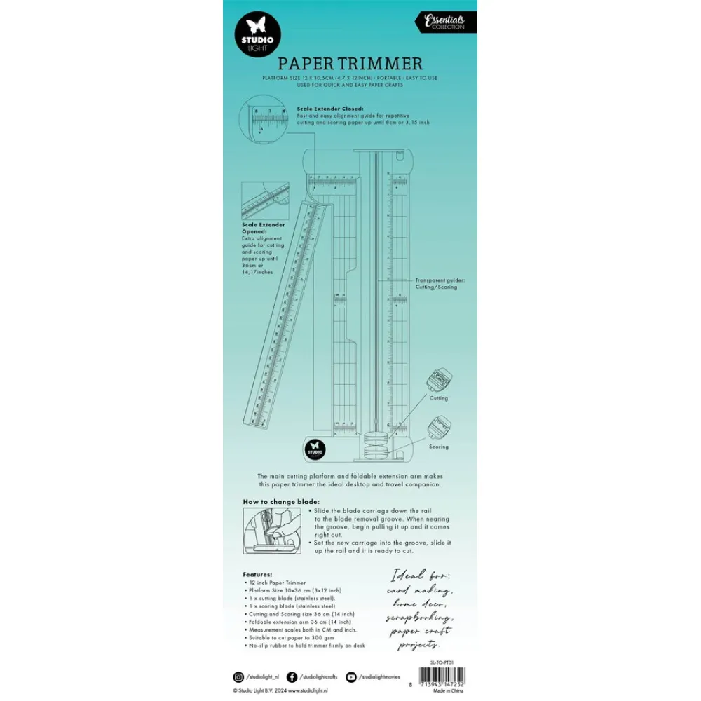 Essentials by Studio Light. The main cutting platform and foldable extension arm makes this paper trimmer the ideal desktop and travel companion. Paper Trimmer. Essentials Tools. 135x378x30mm. 1 PC. Platform size 12x30.5 cm / 4.7x12 inch. Portable. Easy to use. Used for quick and easy paper crafts.