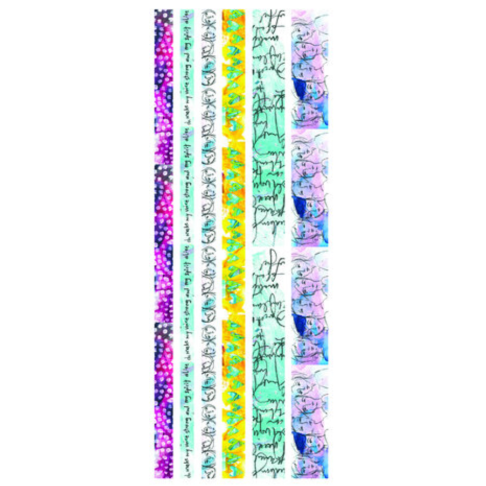 Dina Wakley Media Washi Tape features exclusive artwork from Ranger Signature Designer, Dina Wakley. Collage tape into mixed media projects, journal pages, or use to bind art journals and other books. Each roll measures 6 yards (5.49 m) and each set contains various widths.