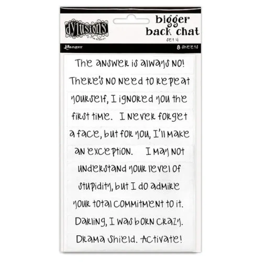 Your favorite bold Dylusions Back Chat is back! A fun assortment of label stickers from the Queen of Sass herself including some of her favorite sarcastic commentary and quotes. Available in two new packs, black with white printing and white with black printing. Collage into your journal pages, paper crafts, and more. Each pack includes eight sheets 4" x 6" (10.2 x 15.2cm).