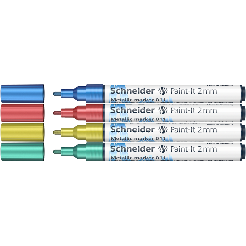 Metallic marker voor buitengewone effecten. Ronde punt voor een fijne lijnbreedte van ca. 2 mm. Schrijfkleur blue metallic, red metallic, yellow metallic, green metallic. Nieuwe pigmenttechnologie maakt een schone en homogene kleurtoepassing mogelijk. De met kleurpigmenten omhulde aluminiumdeeltjes geven een zeer metaalachtig effect met een uitzonderlijk hoge glansgraad, zelfs bij verschillende lichtinvallen. Geschikt voor vele ondergronden. Beste resultaten op donkere en niet-absorberende ondergronden. Sneldrogende inkt perfect gecontroleerd door een klep.