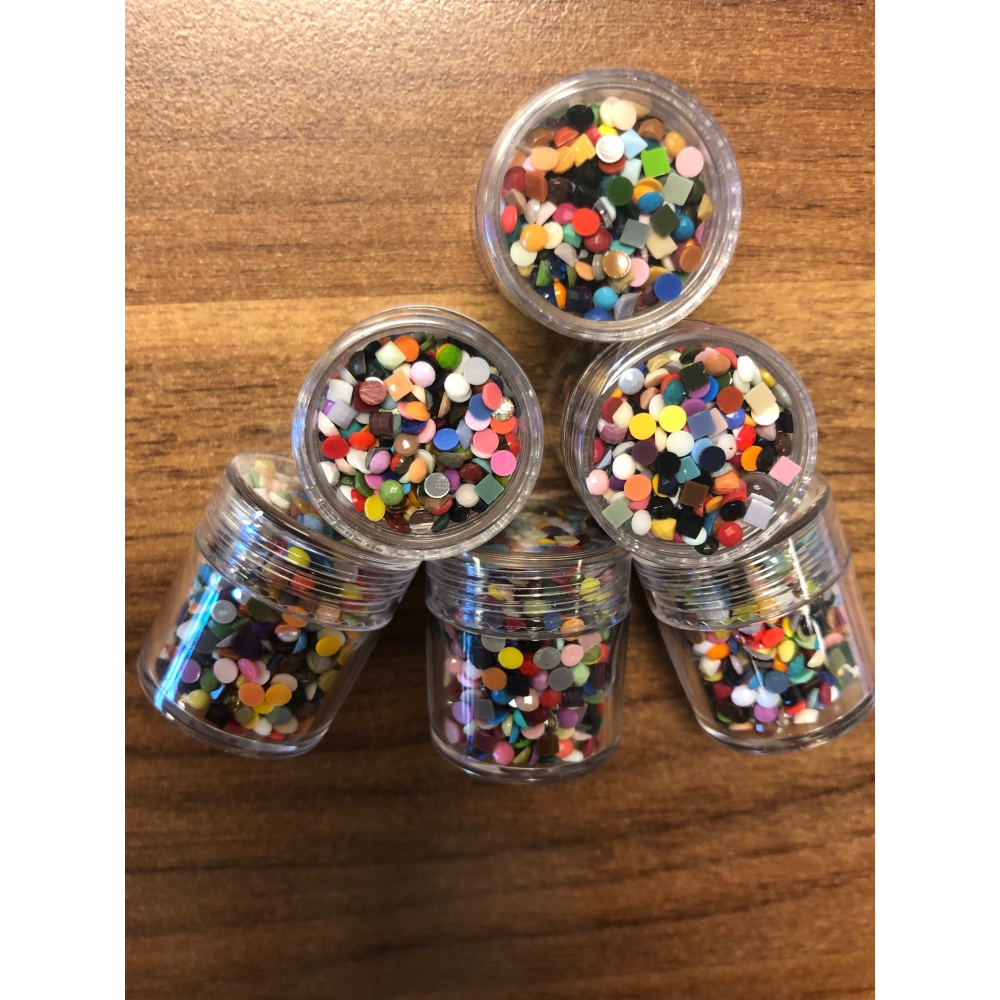Een potje gevuld met een mix van kleine steentjes, ook wel te herkennen als Diamond painting steentjes.