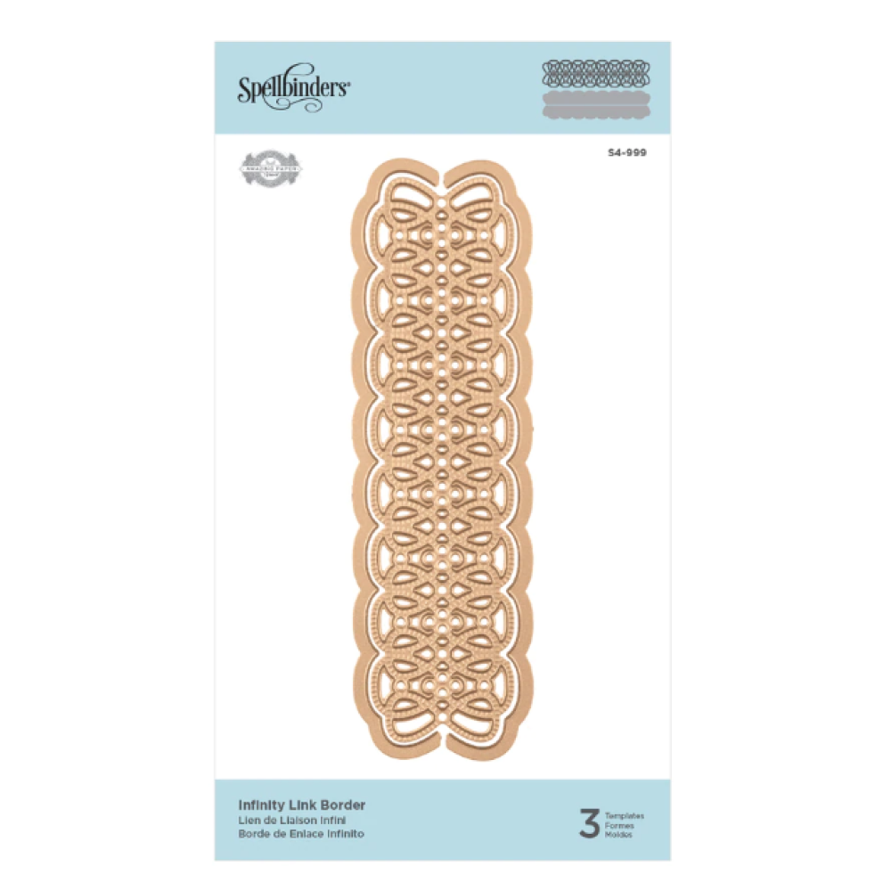 Shapeabilities Infinity Link Border Etched Dies Vintage Treasures van Becca Feeken is een set van drie stansen met een prachtig oneindig link-ontwerp met zijn twee buitenste randstukken. De twee buitenste gesneden stukken kunnen samen met het randontwerp een heel topperstuk vormen. Gebruik een van de buitenste uitgesneden stukken en het creëert een decoratieve rand. Vintage Treasures Collection van Becca Feeken brengt klassieke ronde motieven en elegante bloemen tot leven. Een perfecte aanvulling op haar andere Spellbinders collecties voor het maken van prachtige projecten! Geschatte afmetingen: Buitenrand: 6,15 x 1,65 inch 15,60 x 4,20 cm, geribbelde rand: 6,10 x 1,60 inch 15,50 x 4,10 cm