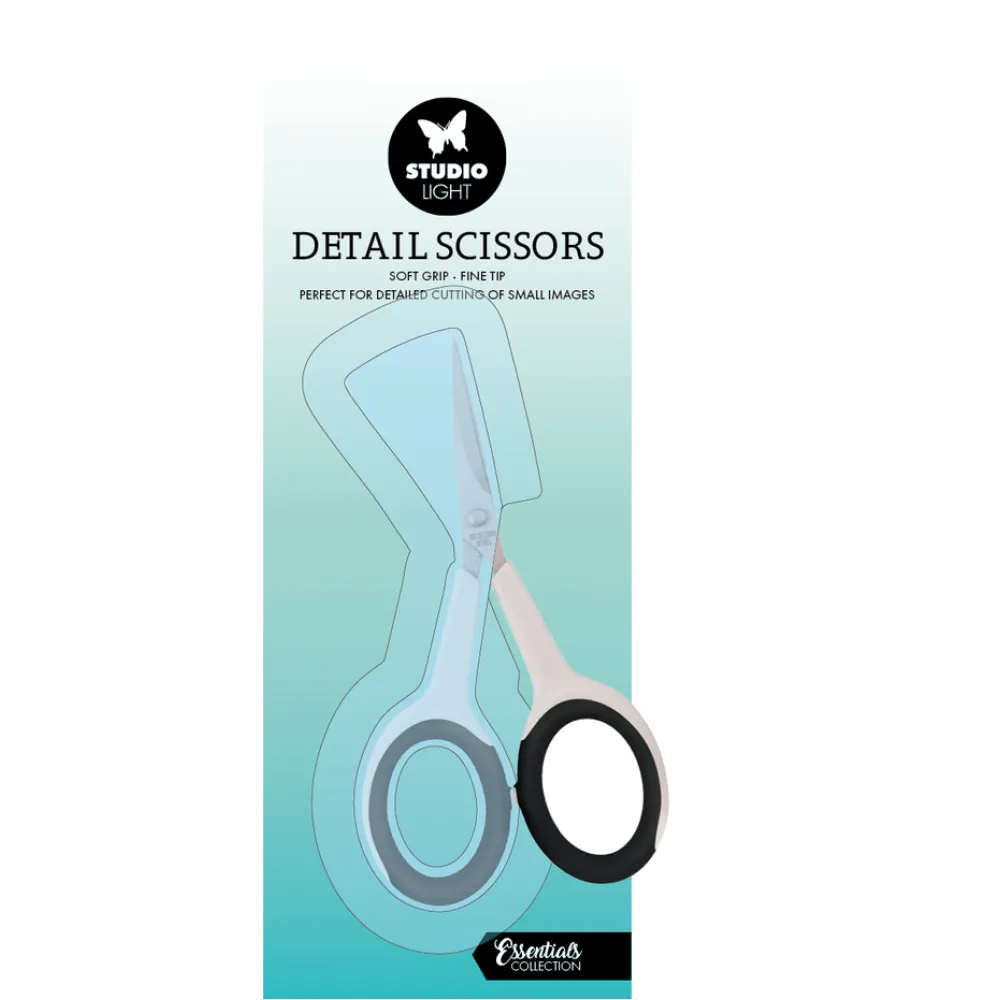 Essentials Tools by Studio Light. Detail Scissor. Soft grip. Fine tip. Perfect for detailed cutting of small images. 60x104x5mm. Ideal for cutting narrow patterns and for quick cuts through a wide range of materials, including paper, cardboard, fabric and much more. Stainless steel blades ensure clean cuts and stay sharp even with intensive use. Soft grip handle provides excellent control for right and left handed users and helps reduce hand fatigue on big projects.