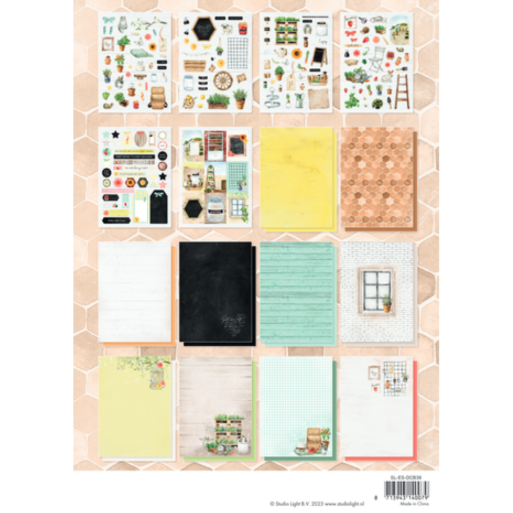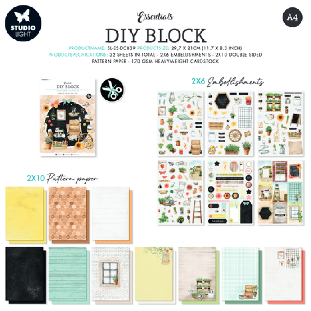 Essentials by Studio Light. A4 DIY Block with cardstock and die-cuts. 6x2 embellishments (die-cuts). 10x2 double-sided pattern paper. 170gsm cardstock. Acid and lingin free. Pad: 210x297x8mm.