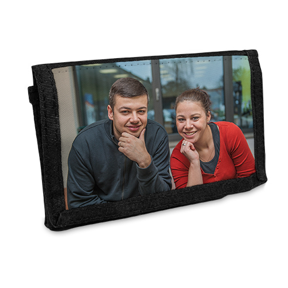 Een betaalbare portemonnee met aan de buitenkant een foto of naam bedrukt.