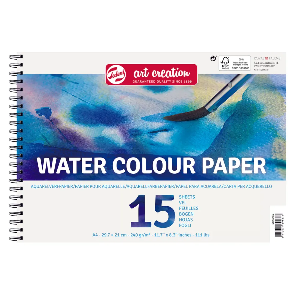 Talens Art Creation aquarelverfpapier is speciaal geprepareerd voor gebruik met aquarelverf. Het papier kan verschillende lagen water en waterverf aan en is makkelijk om overal mee naartoe te nemen. Elk blok bevat 15 vellen A4 (29,7 x 21 cm) papier van 240 g/m². Het papier is aan een kant ringgebonden zodat het perfect plat blijft tijdens gebruik en makkelijk te verwijderen is zodra je klaar bent met schilderen door de geperforeerde rand aan de bovenkant van de pagina.