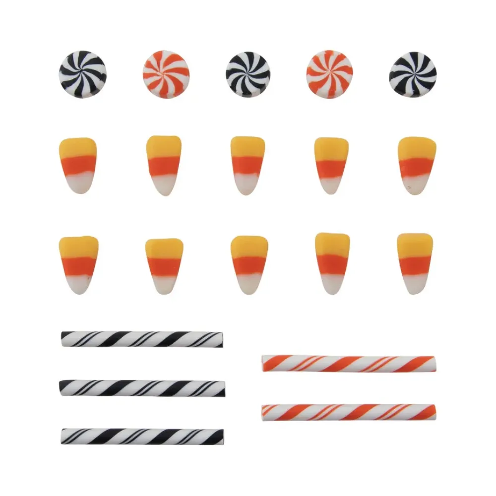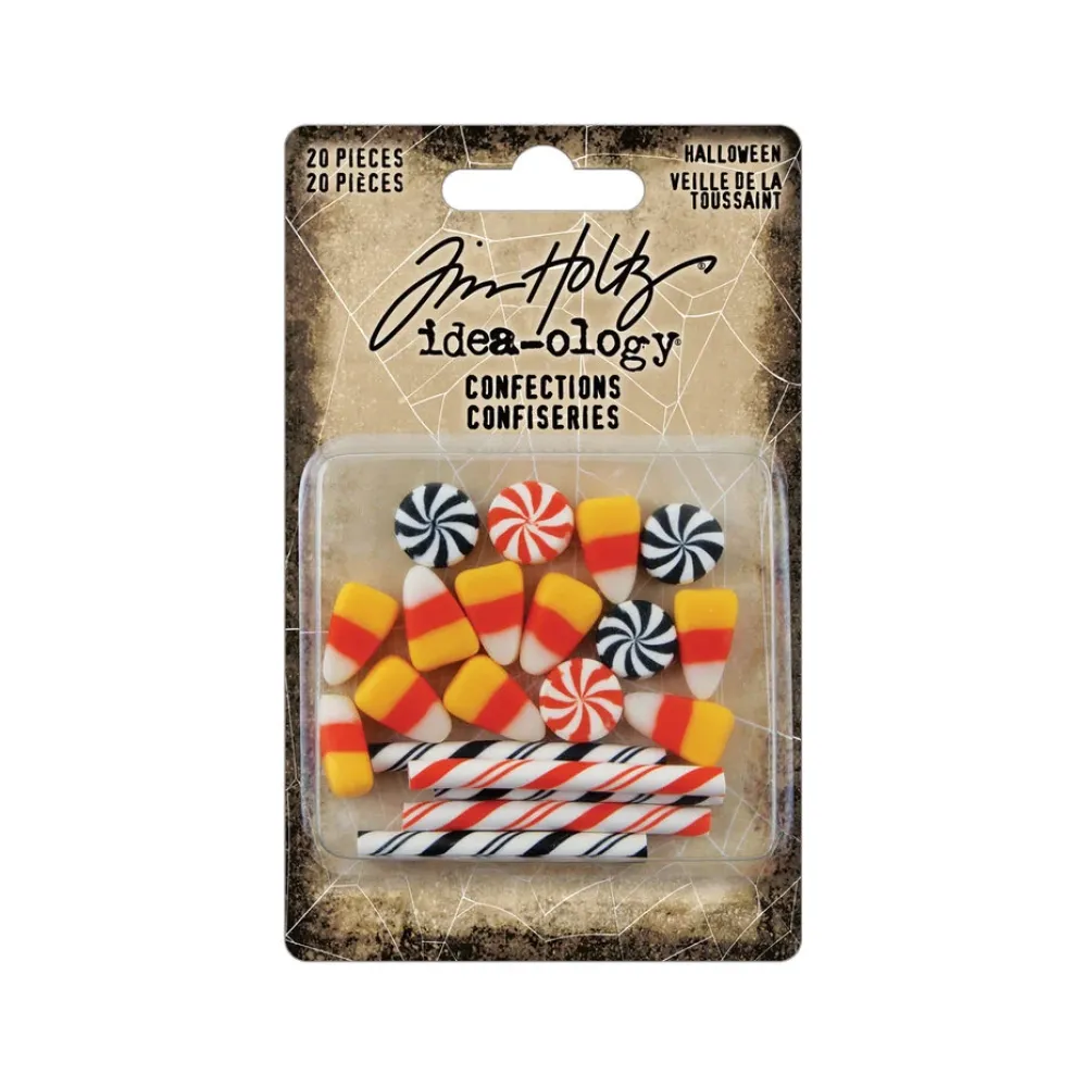Three-dimensional, miniature, and oh so cute. These Candy Corn and assorted striped candies are delightful, dimensional treats perfect for any Halloween make. Fill Tim's Cauldrons, or Jack-O-Lanterns then use as a dimensional elements on cards, invitations, jewelry pieces or assemblage projects. Candy Corn measures 1/2" in height. Sticks measure 1 1/2" in height and round candies measure 3/4" in diameter. Package contains 20 resin pieces.