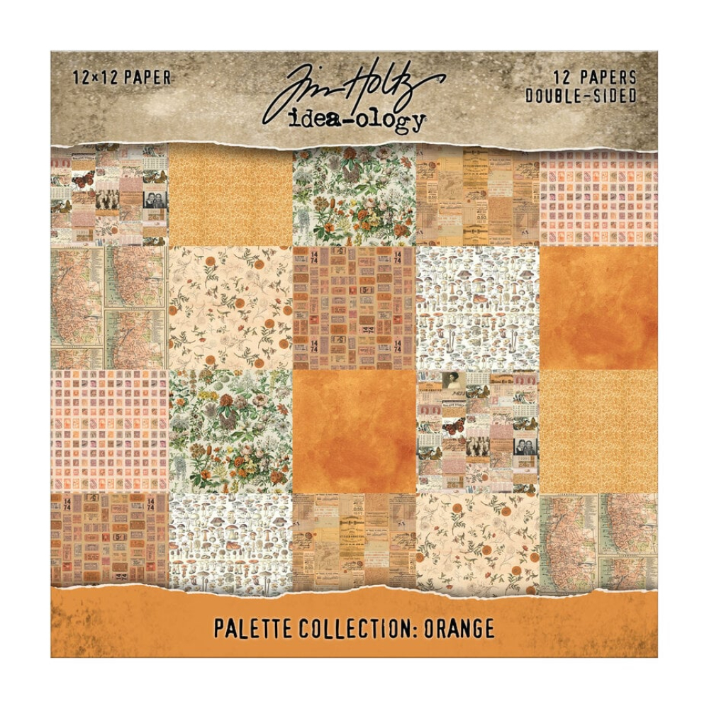 Tim Holtz Idea-ology Palette Collection: Orange 12 x 12. Warm, earthy, and beautifully nostalgic, the Palette Collection: Orange channels the essence of fall, nature, and sun-washed vintage stories. From pumpkin spice tones to deep rust and soft creams, this 12-sheet double-sided collection blends botanical prints, nostalgic textures, travel snippets, ledgers, and cozy check patterns for a grounded, seasonal aesthetic. Autumn-inspired hues that evoke falling leaves, warm afternoons, and rustic charm. A collection of papers perfect for scrapbooking, junk journals, and mixed media arts. Constructed of paper. 12 inches x 12 inches. 12 double-sided papers.