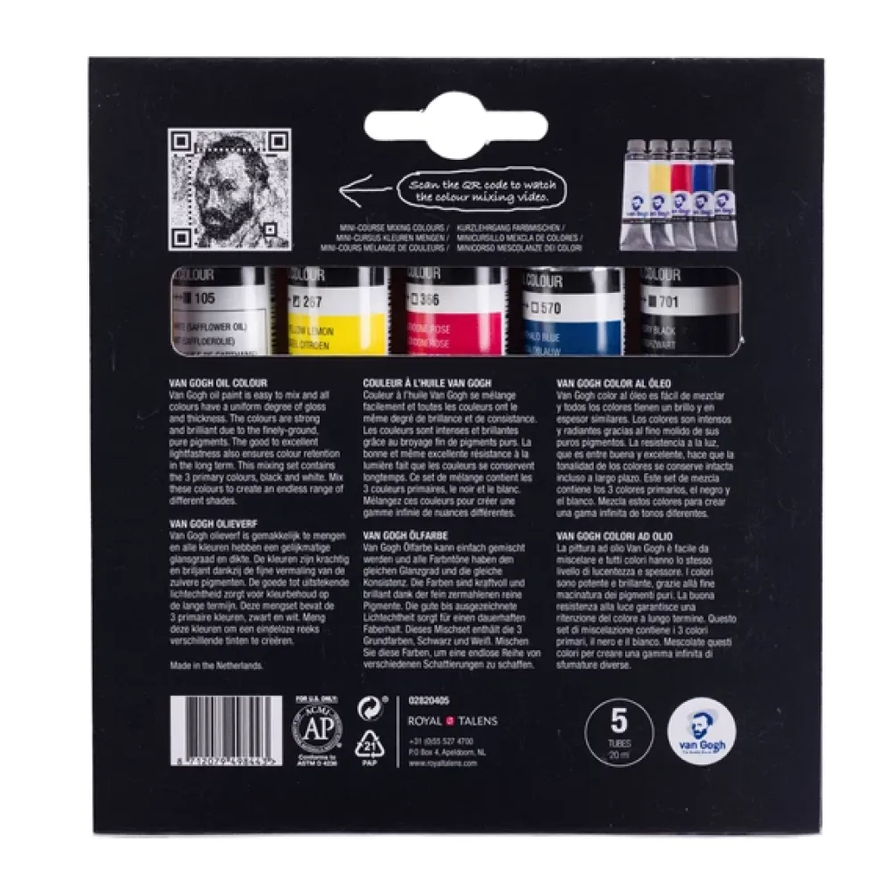 Deze primaire mengset bevat 5 tubes olieverf in de 3 primaire kleuren, zwart en wit. Meng deze kleuren om een eindeloze reeks verschillende tinten te creëren. De set bevat ook een brochure met informatie over het mengen van kleuren en een QR-code die naar onze website leidt voor aanvullende informatie en een gedetailleerde video.
