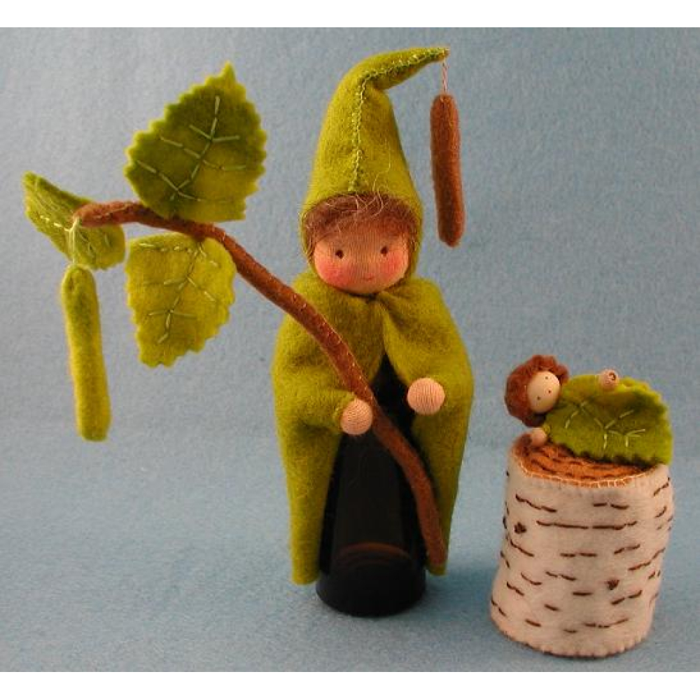 Een popje gemaakt op een bruin glazen flesje. Dat geeft een prachtig effect en blijft ook nog eens stevig staan. De blaadjes en het bladbaby’tje zijn van lentegroen sprookjesvilt gemaakt.