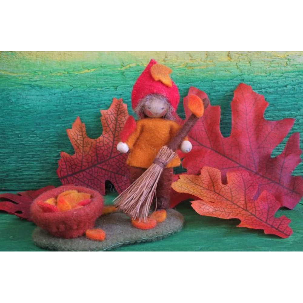 Aan de temperatuur zou je denken dat het nog zomer is maar rond de deur van het atelier heb ik de eerste herfstbladeren alweer moeten vegen. Ze waaiden naar binnen, werden vertrapt en bleven tijdens het snijden aan het vilt plakken. Dat mag natuurlijk niet gebeuren. Daarom werd dit pakket ooit ontworpen: het was de bedoeling dat de kaboutertjes dit klusje gingen klaren maar ze staan alleen maar mooi te zijn op de plank. Ach, dat is waarschijnlijk ook hard werken. Mij zal het in elk geval niet lukken, ik ben liever in de weer met de schone lappen vilt.
