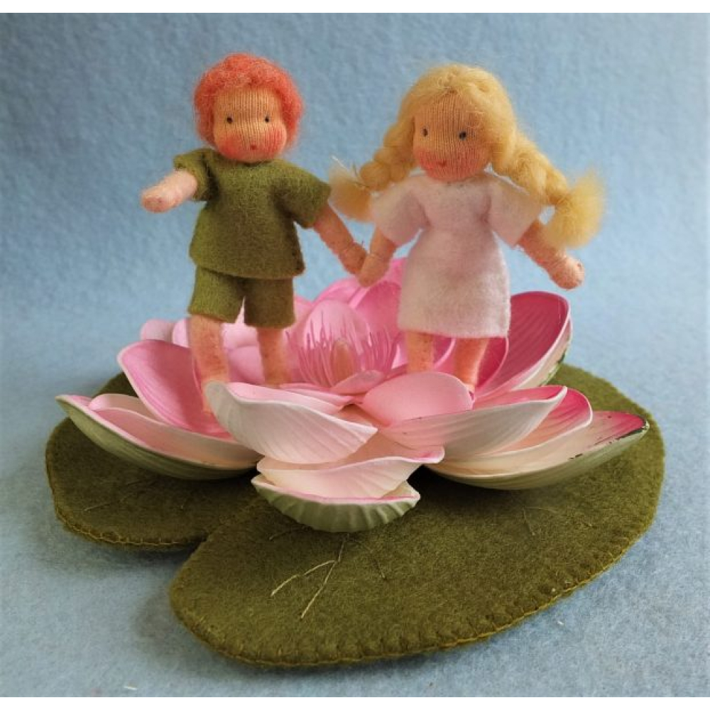 Het is niet het best verkopende ontwerp maar ik vind ze zelf erg schattig: het broertje en zusje. Of vriendje en vriendinnetje of buurjongen en buurmeisje als je die erin ziet. Omdat de etalage roze was had ik ze in een roze lotusbloem gezet. Het groene blad was nogal verkleurd dus werd die vervangen door een vilten blad. Waarschijnlijk blijven ze nu voor altijd hand in hand in de bloem staan.