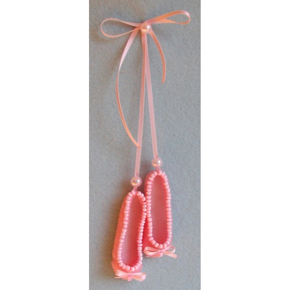 Twee schoentjes om vrolijk van te worden. Ze hangen aan een satijnlintje en zijn versierd met kralen. Leuk als cadeautje maar ook leuk aan je tas, sleutelbos  of voor sier in huis.
