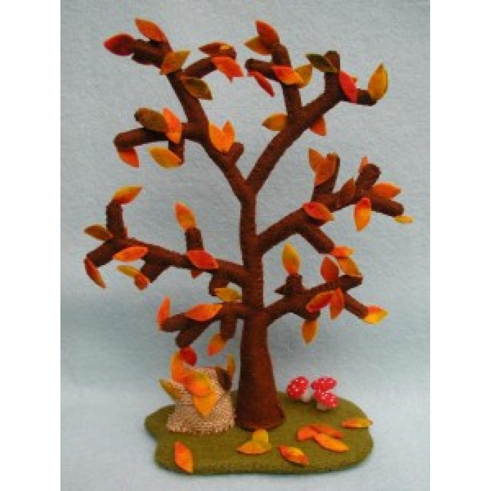 De boom heeft prachtige herfstbladeren van wolvilt. Er onder staat een bladerenmand van jute en groeien paddenstoelen. Met kleine aanpassingen is deze boom om te toveren in een winter, lente en zomerboom. De boom is 21 cm hoog en een echte aanwinst voor de herfsttafel.