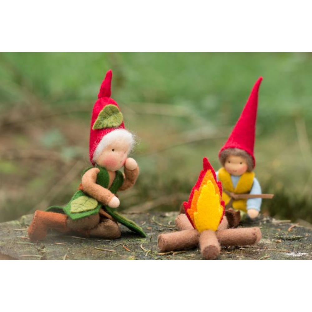 De kabouters warmen zich aan een vuurtje en hebben elkaar ondertussen van alles te vertellen. Waar ze de rijpe bramen groeien, hoe koud het komende winter gaat worden, waar de Vlaamse gaai zijn voorraad heeft verstopt enz. Waar je normaal goed moet oppassen met vuur, kun je dit vuurtje onbeheerd achter laten en kinderen ermee laten spelen.