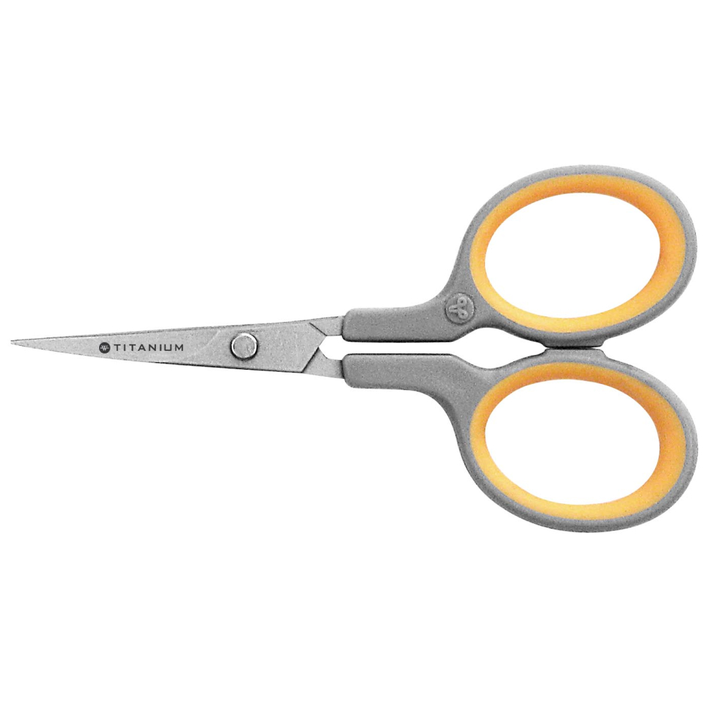 Silhouetschaar, 10cm, Titanium nitride gebonden materiaal, gemaakt uit een legering van rvs en titanium, waardoor de titanium laag niet kan slijten. Fijne punt voor precies en accuraat werken. Zeer geschikt voor 3D techniek. Geschikt voor links- en rechtshandig gebruik. Softgrip handgreep. Garantie: 25 jaar. Geleverd op blisterkaart met europonsing.